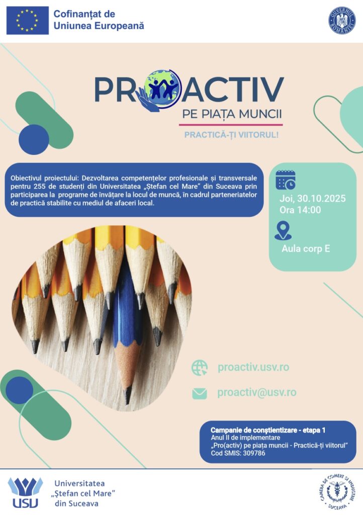 Joi, 30 octombrie 2025, ora 14 în Aula corp E va avea loc Campania de conștientizare – etapa 1- anul II de implementare- pentru proiectul „Pro(activ) pe piața muncii – Practică-ți viitorul!” Cod SMIS: 309786